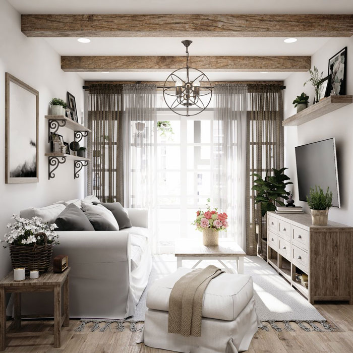- Còn về rèm cửa, để đúng gu của phong cách country thì sẽ là những tấm màn cửa đầy màu sắc sặc sỡ, giúp tạo sự phong phú cũng như tránh sự nhàm chán trong thiết kế.