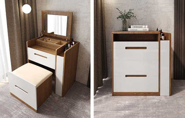 Các mẫu bàn trang điểm thông minh ngày nay không thể thiếu laminate bởi màu sắc phù hợp, dễ thiết kế và thi công, gọn gàng tiết kiệm không gian.