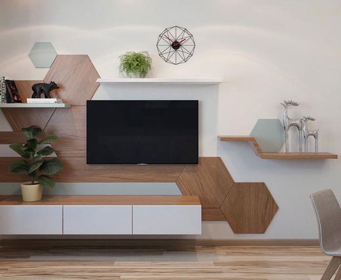 Kệ tivi hay các vách kệ tivi bằng gỗ laminate là giải pháp hoàn hảo thay cho cấu trúc tường đơn điệu, bạn có thể thêm các đường nẹp chỉ inox, kết hợp đèn led để không gian thêm ấn tượng hơn.